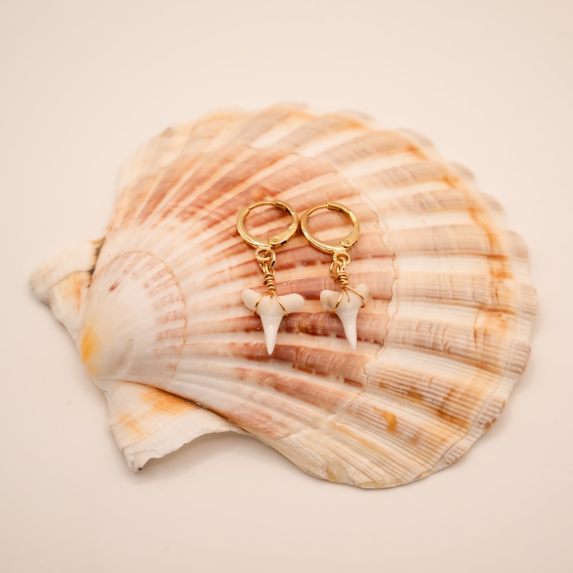 Each tooth tells a story of the sea—naturally shed and responsibly gathered to ensure no harm to sharks or their environment. Paired with polished hoops, these earrings balance raw ocean energy with effortless coastal style. Perfect for ocean lovers, divers, surfers, and anyone who wants to wear a little piece of the sea.