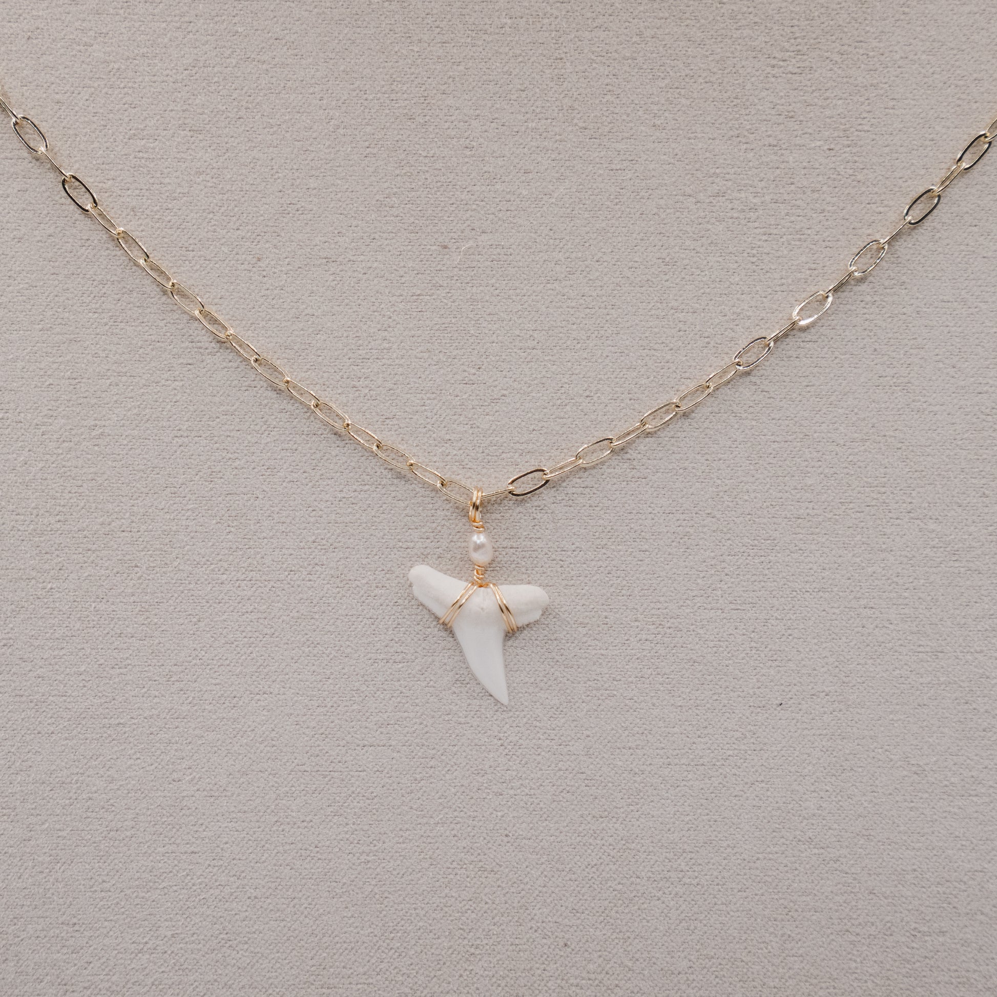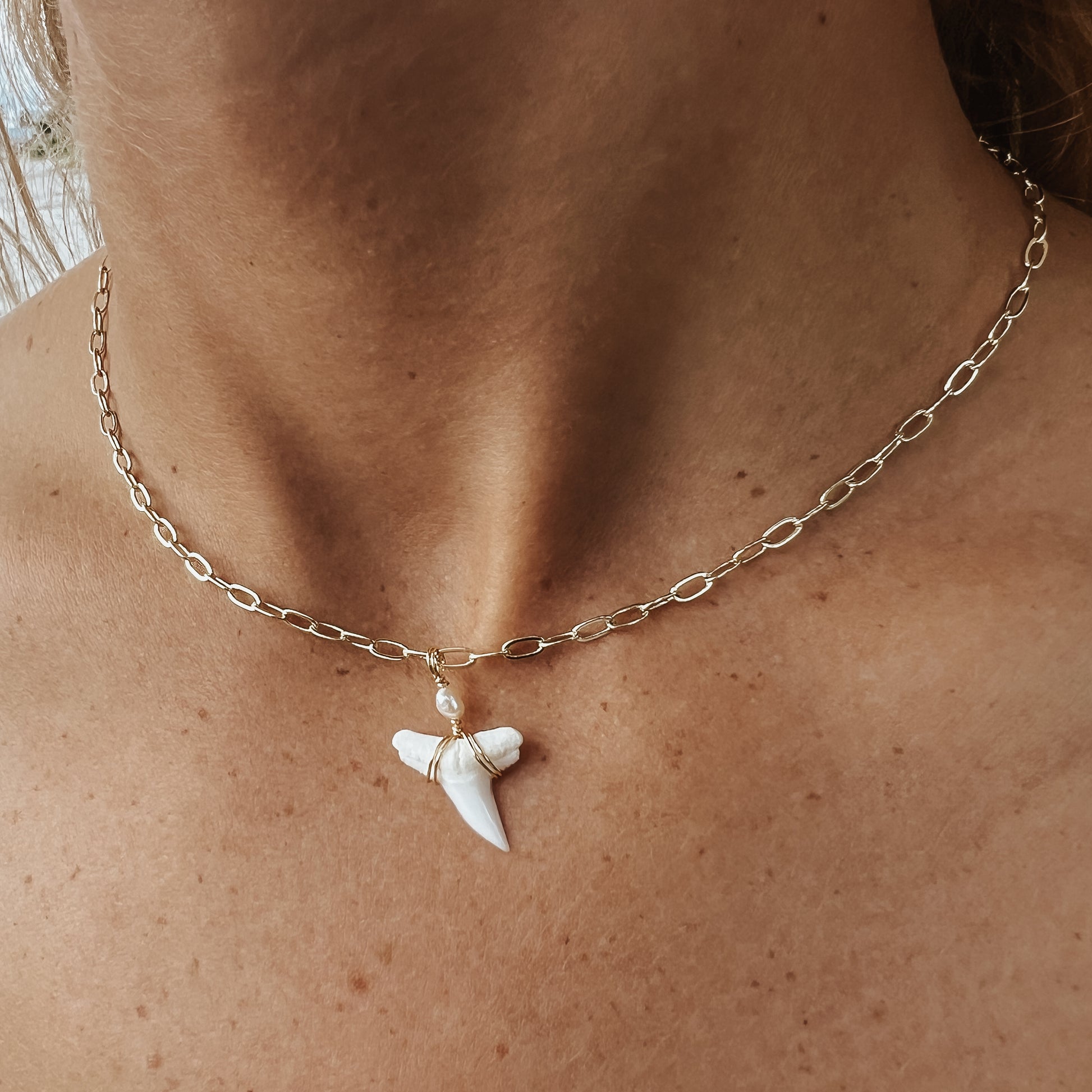 Elevate your beachy style with this one-of-a-kind White Fresh Shark Tooth Necklace, featuring a genuine freshwater pearl and a 14k gold filled paperclip chain. Each shark tooth is ethically and sustainably collected during shark dives in Florida, making every piece truly special and responsible.